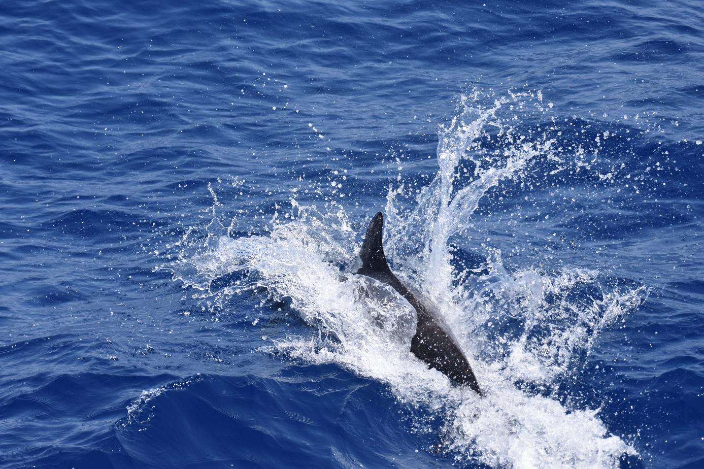 Die See hier im Angolabecken ist recht ruhig. Mittlerweile sind wir auch soweit von der Küste entfernt, dass wir kaum noch Tiere zu Gesicht bekommen. Noch nicht mal Seevögel sind auszumachen. Eines Morgens jedoch taucht eine Gruppe Delphine neben dem Schiff auf. Diese Schule, bestehend aus 20 - 25 Tieren und begleitet uns für eine Viertelstunde, bis sie schließlich das Interesse an uns verlieren und in eine andere Richtung weiter schwimmen.