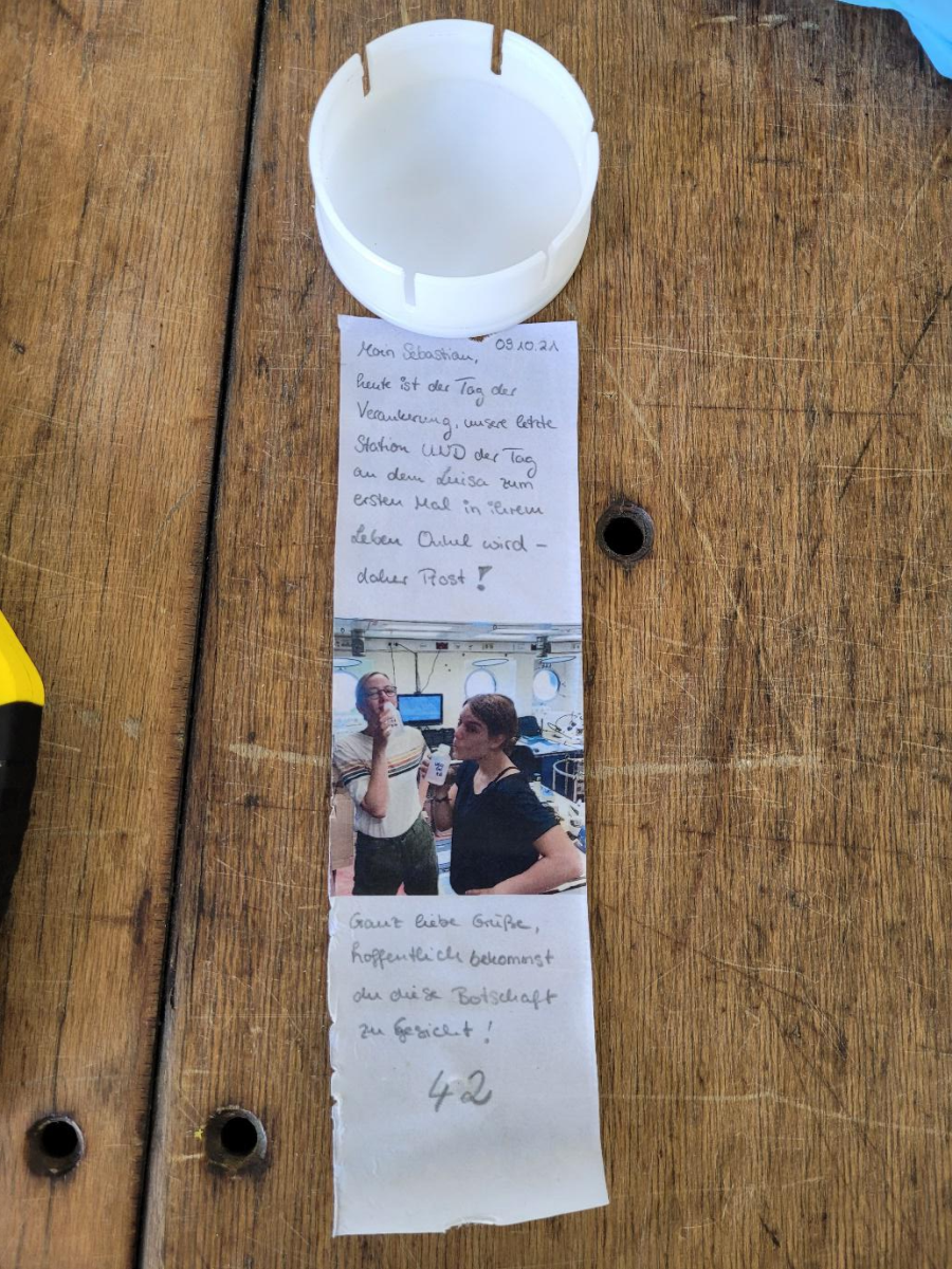 Eine der letzten Aktionen auf diesem Transekt ist die Bergung einer Mooring-Station, also einer Langzeit-Verankerung. Zwischen dem Ankerstein am Meeresboden und dem Auftriebskörper, der in der Wassersäule schwebt, sind unterschiedliche Messinstrumente angebracht, die die Temperatur, den Druck, den Salzgehalt, die Sauerstoffkonzentration und die Strömung messen. Bei der Bergung erwartete vor allem Sebastian Beier eine kleine Überraschung in Form einer kleine Flaschenpost, die bei der Ausbringung im Oktober 2021 für ihn hier hinterlassen wurde. Was für eine schöne und lustige Idee.