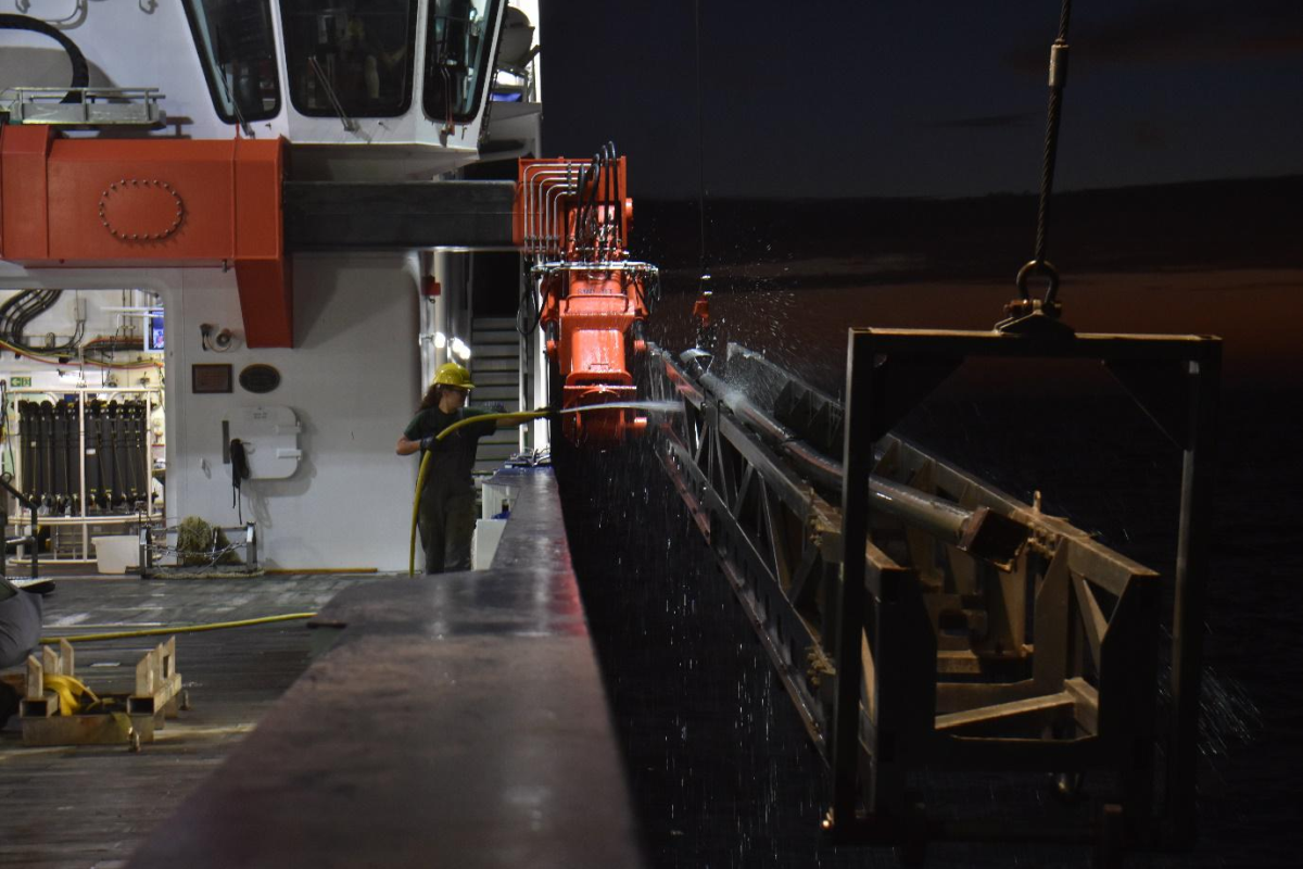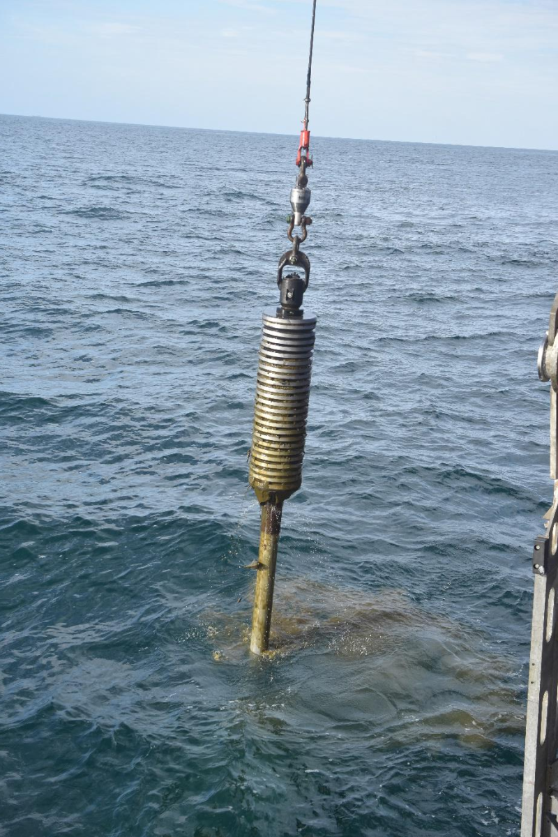 So richtig ans Werk ging es nun auch für die Geologen unter uns. Das Schwerelot, auch Gravitiy Corer genannt, kam endlich zum Einsatz. Hierbei handelt es sich um ein langes Stahlrohr, dass über eine spezielle Absetzvorrichtung ins Wasser gelassen wird und auf den Meeresboden absinkt. Am oberen Ende dieses Rohres ist ein 1,5-t-schweres Gewicht angebracht, so dass sich das Rohr beim Auftreffen auf Grund bis zu 10 m sich in den Meeresboden gräbt. Der so gewonnene Bohrkern wird dann an Bord geholt und von dem Geologen Michael Kossack und seinen beiden studentischen Hilfskräften untersucht und für weitere Analysen beprobt. In seiner Doktorarbeit untersucht Michael anhand der Sedimentkerne aus Schwerelot und MUC, wie sich die Sauerstoffkonzentration im Bodenwasser über dem flachen Kontinentalschelf seit der letzten Eiszeit entwickelt hat. Dabei nutzt er das Umweltverhalten von Spurenmetallen wie Uran und Molybdän die je nach Sauerstoffgehalt in unterschiedlichen Mengen im Sediment vorkommen.