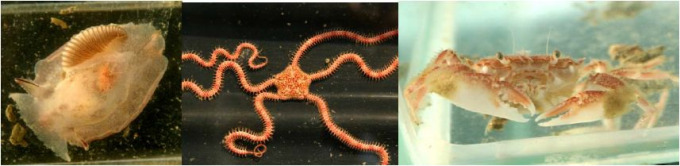 Faszination Makrozoobenthos: Die Formen- und Artenvielfalt der Mollusken (eine gehäuselose Schnecke der Gattung Pleurobranchaea, links), Stachelhäuter (ein Schlangenstern, Mitte), Krebstiere (Krabbe aus der Familie Grapsidae, rechts) und der anderen bodenlebenden Bewohner vor der Küste Angolas ist beeindruckend. Foto: A. Darr