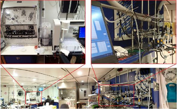 Mikroelektroden-Installation und Nährstoff-Autoanalyser im Chemie-Labor von MERIAN zur kontinuierlichen Messung des Wassers das mit Hilfe der Pump-CTD entlang eines hochauflösenden Vertikalprofils in der oberen Wassersäule entnommen wird (Foto: Sascha Plewe).