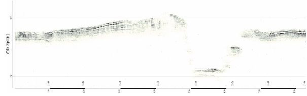Sedimentakustisches Querprofil durch den hier 1 km breiten und 80 m tief eingeschnittenen submarinen Dnjepr Canyon in ca. 1600 m Wassertiefe mit angedeuteter Beprobungsstation.