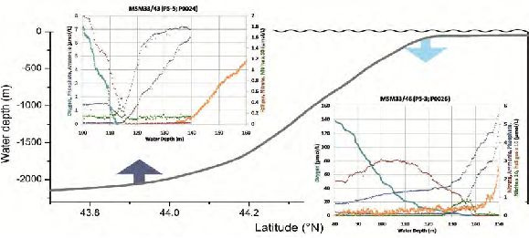 Die hoch aufgelösten Nährstoff- und Gasprofile zeigen, dass sich in küstenferneren Gebieten des schwarzen Meeres (MSM33/43) ein bis zu 20 Meter breiter suboxischer Bereich ausbildet, in dem Sauerstoff und Nitrat aufgebraucht sind, aber noch kein Schwefelwasserstoff auftritt. Im Gegensatz dazu wird in Küstennähe (MSM33/46) vermutlich durch Strömungen Sauerstoff sehr viel tiefer eingetragen und überlappt im unteren Bereich mit der Zone, in der erstmals Schwefelwasserstoff auftritt. Diese beiden Situationen wirken sich offenbar unterschiedlich auf den Phosphor und Stickstoffkreislauf aus, wie die Ammonium, Nitrat, Nitrit und Phosphatprofile zeigen. Besonders der sehr scharfe Nitritpeak auf der küstenfernen Station bei 115 m Wassertiefe und das gleichzeitige Minimum im Phosphat deuten Prozesse an, die in weniger gut aufgelösten Datensätzen bislang nicht erkennbar waren.
