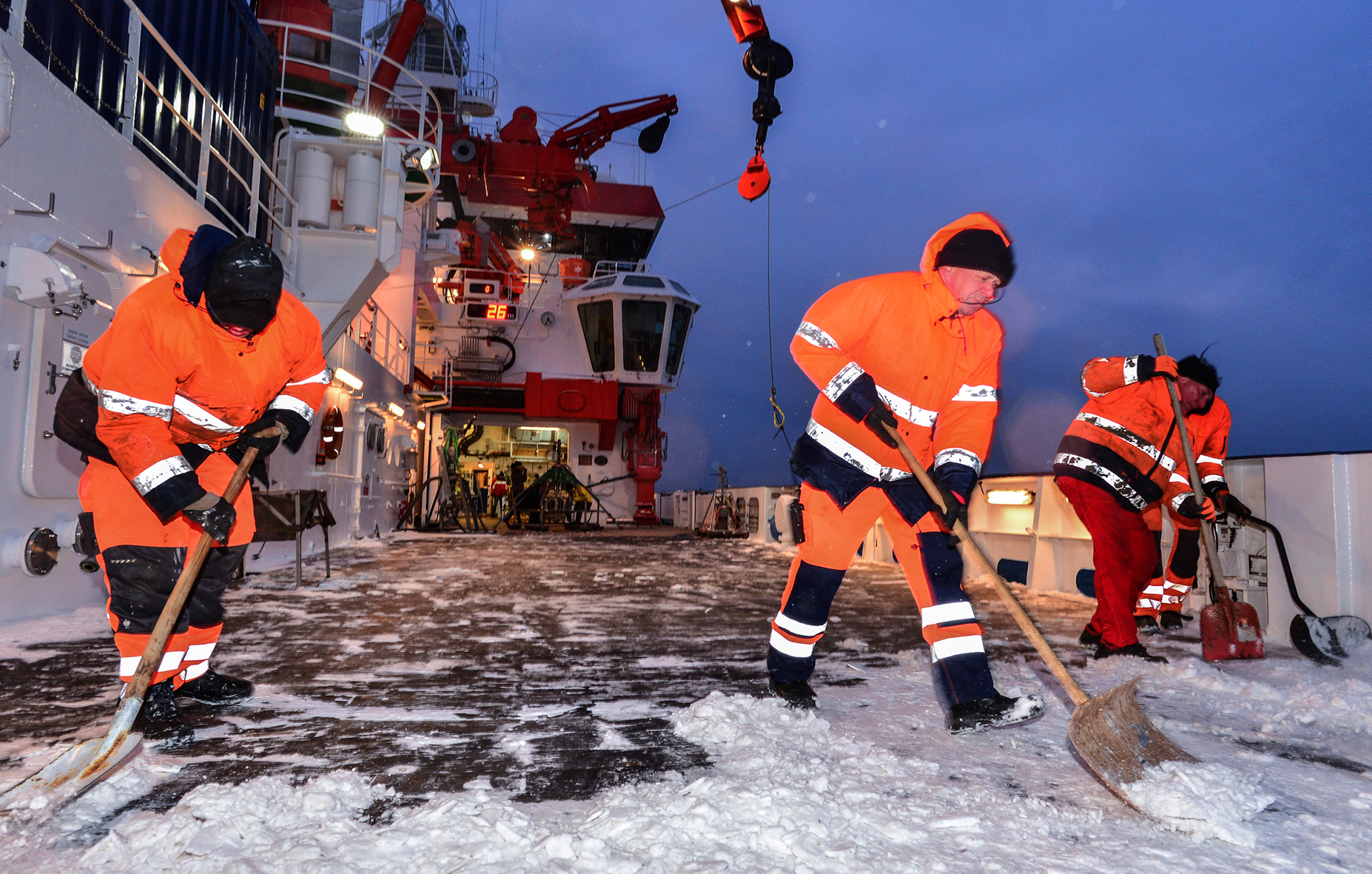 Wirklich Winter: Auch an Bord ist Schneeschieben wichtige Pflicht