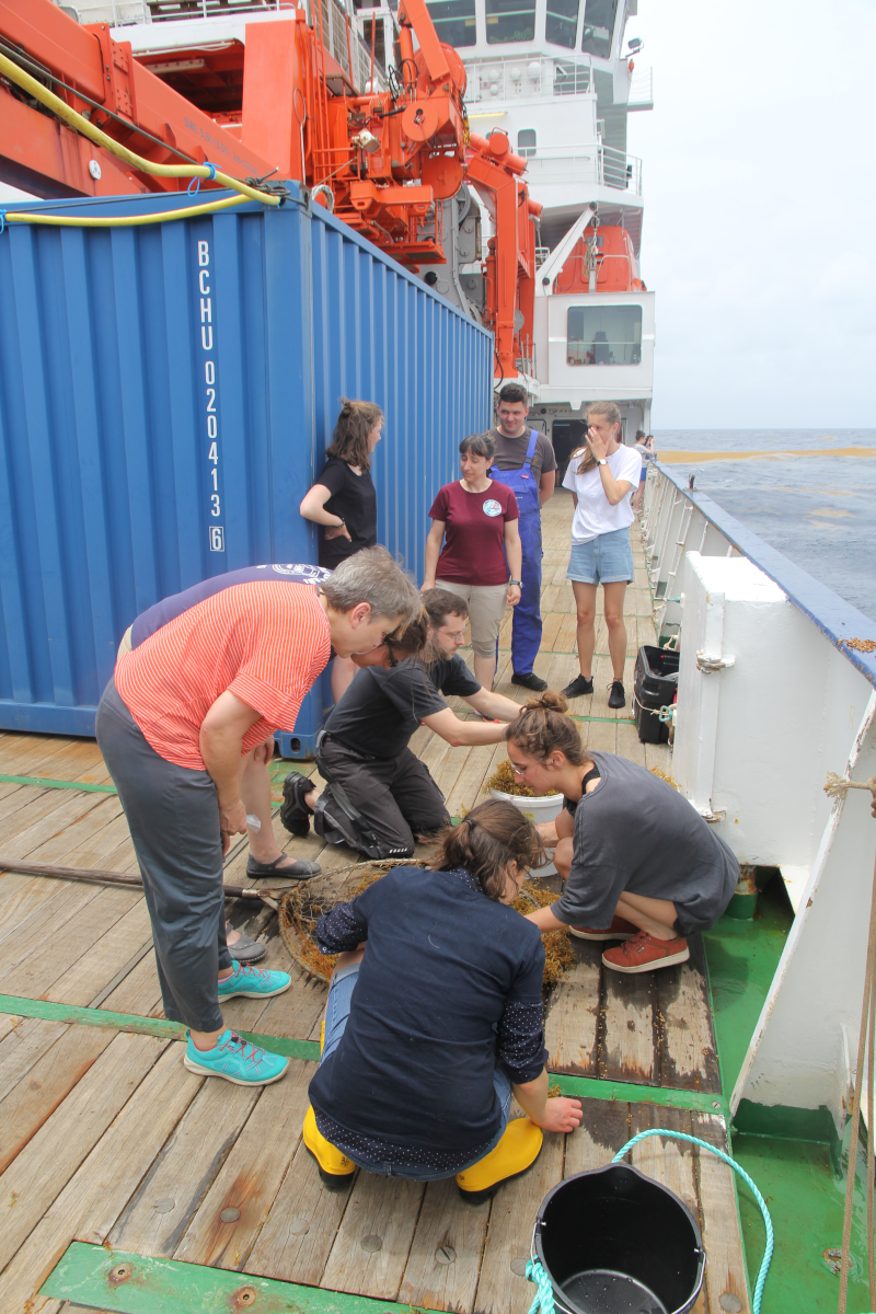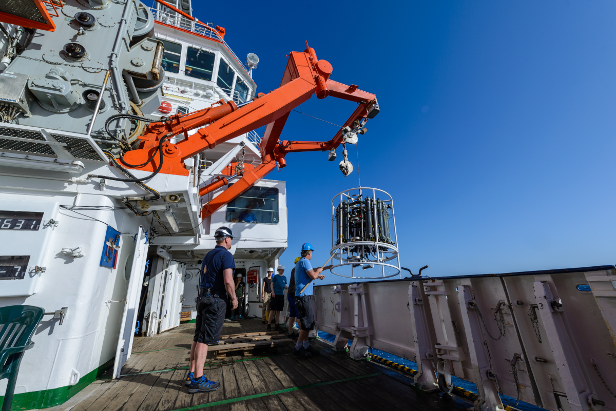 Nicht nur unsere Instrumente müssen gesichert sein! Nachdem alle Geräte aufgestellt waren, bekamen wir unsere Sicherheitseinweisung – mit Vorträgen und Schwimmwesten an Deck. Dann begann das Leben und die Routine an Bord, zwischen den Tests unserer Geräte und den ersten Stationsarbeiten, genießen wir die See und die aufgeregten Sprünge von fliegenden Fischen und Delfinen, die vor dem Bug der Meteor flüchten.
