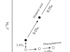 Ein einfacher Vergleich zwischen den δ15N-Werten von Phenylalanin (Phe) und Glutaminsäure (Glu) eines einzelnen Organismus gibt Aufschluss über dessen trophische Ebene oder trophische Position (TP, Bild 2). Das δ15N von Phe bleibt bei jedem trophischen Transfer nahezu unverändert und spiegelt die Isotopenzusammensetzung der Primärproduzenten und ihrer Stickstoffquelle wider (N-Quellen-Proxy). Glu wird jedoch jedes Mal, wenn es an eine höhere Position im Nahrungsnetz transferiert wird, um ~8,0 ‰ im δ15N angereichert. Der Vergleich der Isotopenzusammensetzung dieser beiden Aminosäuren eliminiert daher potenzielle Fehlerquellen, die mit zeitlichen und physiologischen Veränderungen in der Ernährung eines Konsumenten zusammenhängen. Es erlaubt uns, seinen stufenlosen TP im Nahrungsnetz zu definieren, wobei ein TP von 1,0 Autotrophe definiert, ein TP von 2,0 Herbivore, ein TP von 3,0 Carnivore ,ein TP zwischen 2,0 und 3,0, (z. B. von 2,5) Omnivoreund ein TP zwischen 1,0 und 2,0 (z. B. TP von 1,5) so genannte Mixotrophe.