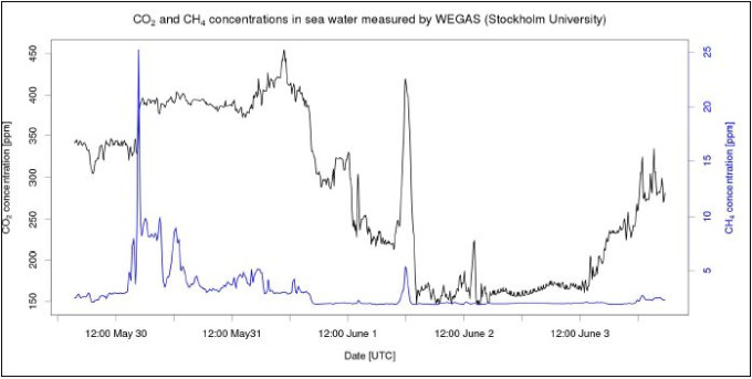 Hintergrund dabei ist, dass die rezente Ostsee als eine schwache Senke für atmosphärisches Kohlendioxid angesehen wird. Bei verstärktem Eintrag organischen Kohlenstoffs von Land und bei einer verstärkten Respiration dieser Komponenten könnte die Ostsee sich aber durchaus in eine CO2-Quelle verwandeln. Mit Hilfe von kontinuierlich ausgeführten Gasmessungen kombiniert mit den Messungen der 13C-Kohlenstoffisotopie wird auf M 87-3a das im Wasser der Ostsee gelöste CO2 näher charakterisiert; und zwar genau jenen Anteil des CO2, das seinen Ursprung in den borealen Wäldern und Sümpfen hat. Dieses ist wichtig zu quantifizieren, da dieses CO2 vermutlich ansteigt und von höchster Klimarelevanz ist: in den Sümpfen und Wäldern über einen langen Zeitraum akkumulierter und teilweise alter organischer Kohlenstoff wird plötzlich freigesetzt, mit den Flüssen in die Ostsee transportiert, dort zu CO2 umgesetzt und letztendlich an die Atmosphäre abgegeben. Dies stellt einen sogenannten “positive feedback” zur CO2 Konzentration in der Luft und damit zur Klimaerwärmung da. In Abb. 5 sind die Konzentrationen der Treibhausgase CO2 und Methan (CH4), die über die gesamte Fahrtstrecke gemessen wurden, abgebildet.