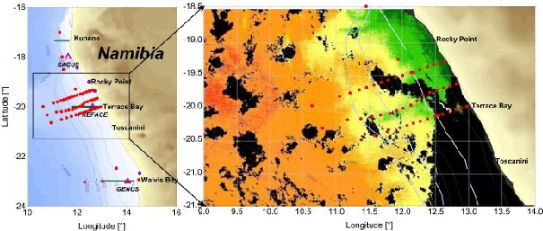 Die Karte (links) zeigt unser Arbeitsgebiet vor Namibia mit den Positionen der Messstationen (rote Punkte). Rechts ein Ausschnitt mit den Wasseroberflächentemperaturen vom 29. Januar, basierend auf den Daten der MODIS Satelliten. Das Auftriebsfilament ist als schmales grünes Band in der Bildmitte zu sehen.