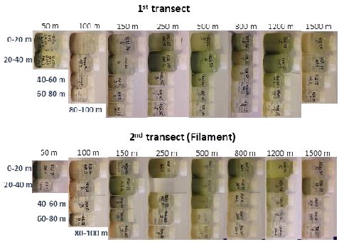 Mikrozooplanktonproben aus den oberen 100 m entlang der ersten beiden beprobten Transekte. Arrangiert von der Küste bis in den offenen Ozean. © Karolina Bohata.