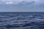 Nach weiteren 550 Metern Leine wurden dann die akustischen Auslöser ins Wasser gelassen. Sie sind ein besonders wichtiger Bestandteil der Verankerung, da sie benötigt werden, um in zwei Jahren die messenden Verankerungskomponenten wiederzubekommen: Nach Aussenden eines akustischen Signals vom Schiff sorgen sie dafür, dass die Leine mit den Instrumenten vom Grundgewicht getrennt wird und an die Oberfläche aufschwimmen kann. Um die Chancen eines erfolgreichen Auslösens zu erhöhen, haben wir zwei unabhängige Auslöser eingebaut. Um 15:13 Uhr, also fast drei Stunden nach dem Kopfauftrieb, konnte endlich das Grundgewicht abgelassen werden. Damit es nicht zu schnell „runterplumpst“, ist es mit einem Fallschirm ausgestattet. Das ist wichtig, denn so können alle Komponenten der Verankerung geordnet nach und nach ohne Verheddern in die Tiefe gezogen werden. Und so haben wir dann auch mit einiger Anspannung Ausschau nach den Auftriebspaketen und der Kopfboje Ausschau gehlaten, um zu sehen, ob alles planmäßig verläuft. Nach und nach – wie es sich gehört – verschwanden die Auftriebspakete von der Oberfläche und nach etwas mehr als zehn Minuten ging die Kopfboje auf Tauchstation. Sie wird in einer Tiefe von etwa 150 bis 200 m stehen, hoffentlich tief genug, um nicht von Fischerei-Aktivitäten beeinträchtigt zu werden.
