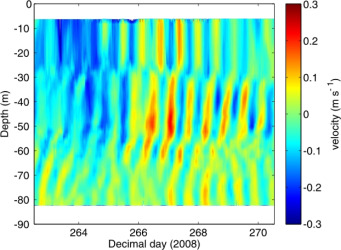 The field work focuses on the contribution of near-inertial waves (see figures on the right) for boundary mixing, and on the behavior of high-frequency internal waves near the slopes. The study areas are the Bornholm Basin and the Stolpe Channel in the southern part of the Baltic Sea. The field program combines high-resolution moored instrumentation with densely-spaced microstructure and velocity transects across the sloping topography of the basin.
