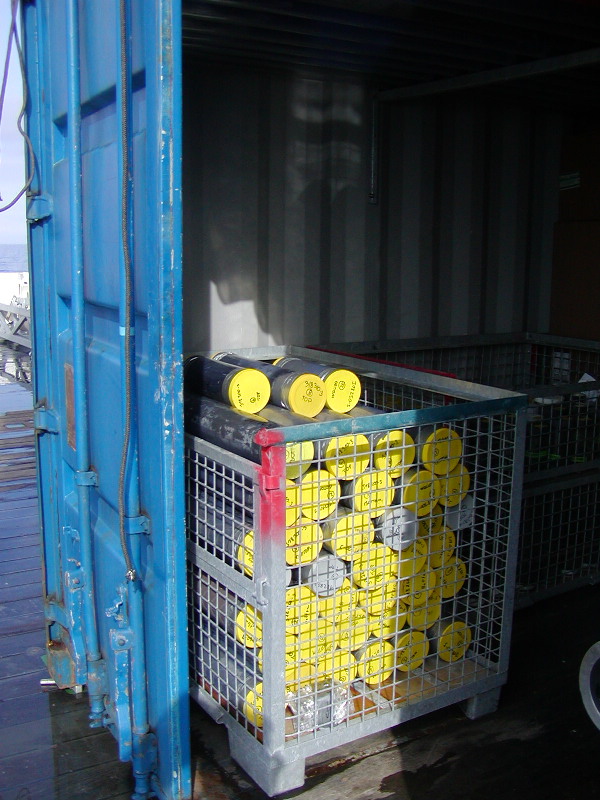 Westliches Arkona Becken, 05.04.06, 10:36 Uhr - Mit Kernen gefüllte Gitterboxen zum Ende der Expedition. Nur ein Teil der Ausbeute.