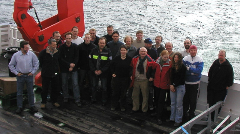 v.l.n.r.: v. Staa (Kapitän, Reederei Briese), Endler (IOW), Nickel (IOW), Eroshenko (Shirshov Institute of Oceanology, RUS), Lemke (Uni Rostock), Bosselmann (Bootsmann, Reederei Briese), Andrén (Uni Stockholm), Wagner (IOW), Krauss (Uni Greifswald), Lis (Uni Szczecin, PL), Bennike (Geol. Survey Denmark), Sevcus (Uni Klaipeda, LT), Harff (IOW, Fahrtleiter), Bening (IOW), Lampe (Uni Greifswald), Nowak (Uni Szczecin, PL), Leipe (IOW), Schmidt (IOW), Bitinas (Geol. Survey, Lithuania), Kotilainen (Geol. Survey, Finland), Frahm (IOW)