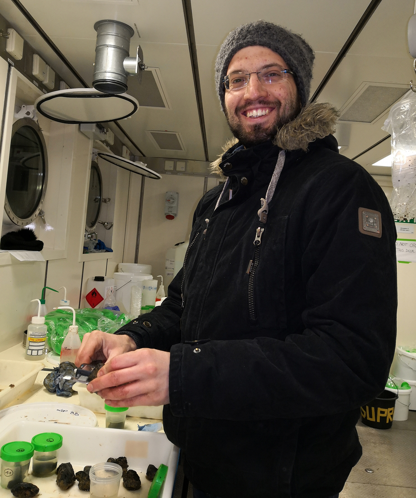 BRIESE-Preisträger Iason-Zois Gazis, hier im Kühllabor bei 4 °C an Bord des deutschen Forschungsschiffs SONNE bei der Vermessung von Manganknollen aus dem Pazifischen Ozean. (Foto: Iason-Zois Gazis)