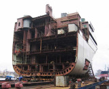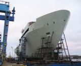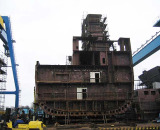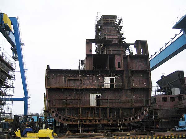Ansicht beider Hälften (noch nicht zusammengeschweißt) auf dem Ponton von Steuerbord vorne