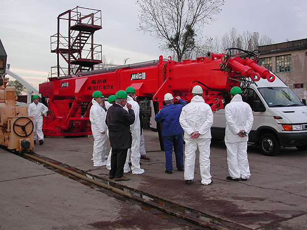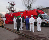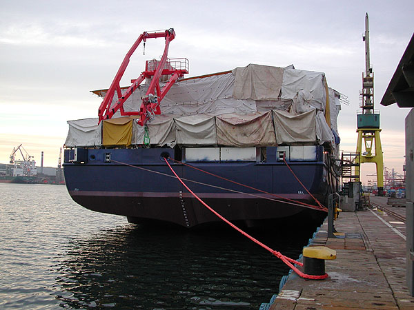 Während an Land der große Schiebebalken auf seinen Aufbau wartet, hier wird er gerade vom Auftraggeber, der Bauaufsicht und der Bauwerft inspiziert