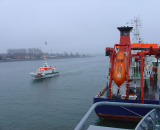 Kurz vor dem Anlegen am Warnemünder Passagierkai: Am Mast weht noch die Flagge der Krögerwerft.