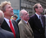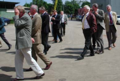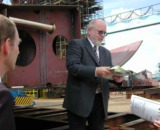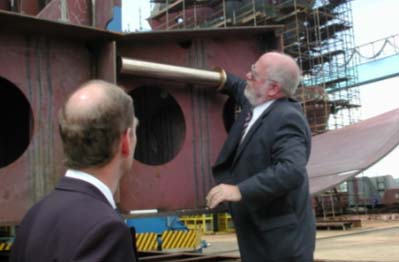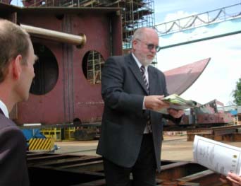 ...aufmerksam verfolgt von dem Vertreter des Auftraggebers (Herrn Ministerialdirigent H. Fischer, stellvertretender Staatssekretär, Ministerium für Bildung, Forschung und Kultur, Mecklenburg-Vorpommern), des BMBF (Herrn Konsul R. Wagner, stellvertretender Generalkonsul der BRD in Gdansk) und des Auftragnehmers (Herrn Herr Dipl.-Ing. H. Kahl, Geschäftsführer Kröger Werft) (von links)...