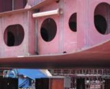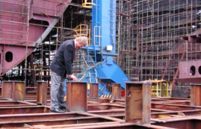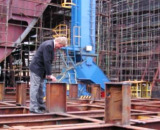 ...der Doppelboden mit dem Zylinder, der die Dokumente der Kiellegung aufnehmen wird. Deutlich zu erkennen ist die starke Bodenplatte mit einer Dicke von 20 mm als Schutz gegen mögliche Eiseinwirkungen. Normale Schiffe dieser Größe haben Bodenplatten von nur ca. 12 mm Dicke...