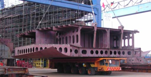 ...die unterste Sektion eines mittleren Schiffsblocks (Gewicht ca. 66 t) wird vom Tieflader auf den Bauplatz gehievt...