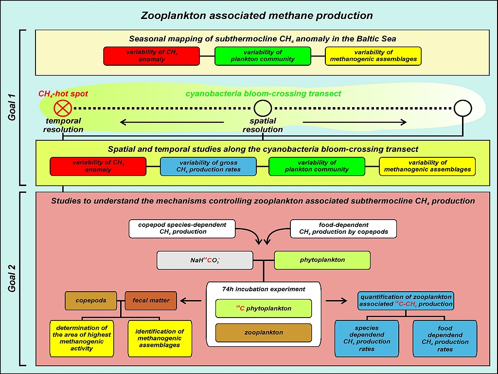 Methan ist ein bedeutendes Treibhausgas, das einen starken Einfluss auf die Klimaentwicklung der Erde nimmt. Zurzeit sind das Wissen um die verschiedenen Methanquellen und deren atmosphärischer Einfluss noch äußerst lückenhaft. Eine Quelle, die hier von besonderer Wichtigkeit sein könnte, ist die mikrobielle Methanproduktion innerhalb des Darms bestimmter Zooplanktonorganismen bzw. der von ihnen ausgeschiedenen Kotpillen. Diese Quelle ist hauptsächlich in der oberen sauerstoffhaltigen Wassersäule angesiedelt und kann somit einen unmittelbaren Einfluss auf den Methanfluss zwischen Ozean und Atmosphäre nehmen. In unserem Projekt stellen wir die Hypothese auf, dass in hochproduktive Regionen, wie z.B. in Randmeeren, diese Zooplankton-basierte Methanproduktion besonders stark ausgeprägt ist. Des Weiteren vermuten wir, dass die zeitweise in der Ostsee beobachtete subthermokline Methananomalie durch diese Methanquelle hervorgerufen wird. Im ZooM-Projekt werden wir deshalb die Zooplankton-assoziierte Methanproduktion im Modellgebiet Ostsee mit Hilfe eines multidisziplinären Ansatzes untersuchen, indem wir die Fachgebiete Methanchemie, Mikrobiologie und Zooplanktologie konzertiert einsetzen. Im Detail wollen wir die folgenden Schlüsselfragen beantworten: (1) Ist die subthermokline Methananomalie ein verbreitetes Phänomen in der Ostsee und können wir saisonale und regionale Unterschiede in ihrer Ausprägung identifizieren? (2) Besitzt die Zooplankton-assoziierte Methanproduktion das Potential die beobachtete Methananomalie auszubilden und wie beeinflussen Copepodenarten und Umweltbedingungen (wie die Nahrungszusammensetzung) die Methanproduktion? (3) Welche methanogenen Mikroorganismen sind in die subthermokline Methanproduktion im Copepoden-Darm und ihren Kotpillen involviert und lassen sich Unterschiede der beteiligten methanogenen Gemeinschaften und deren Aktivität ausmachen?