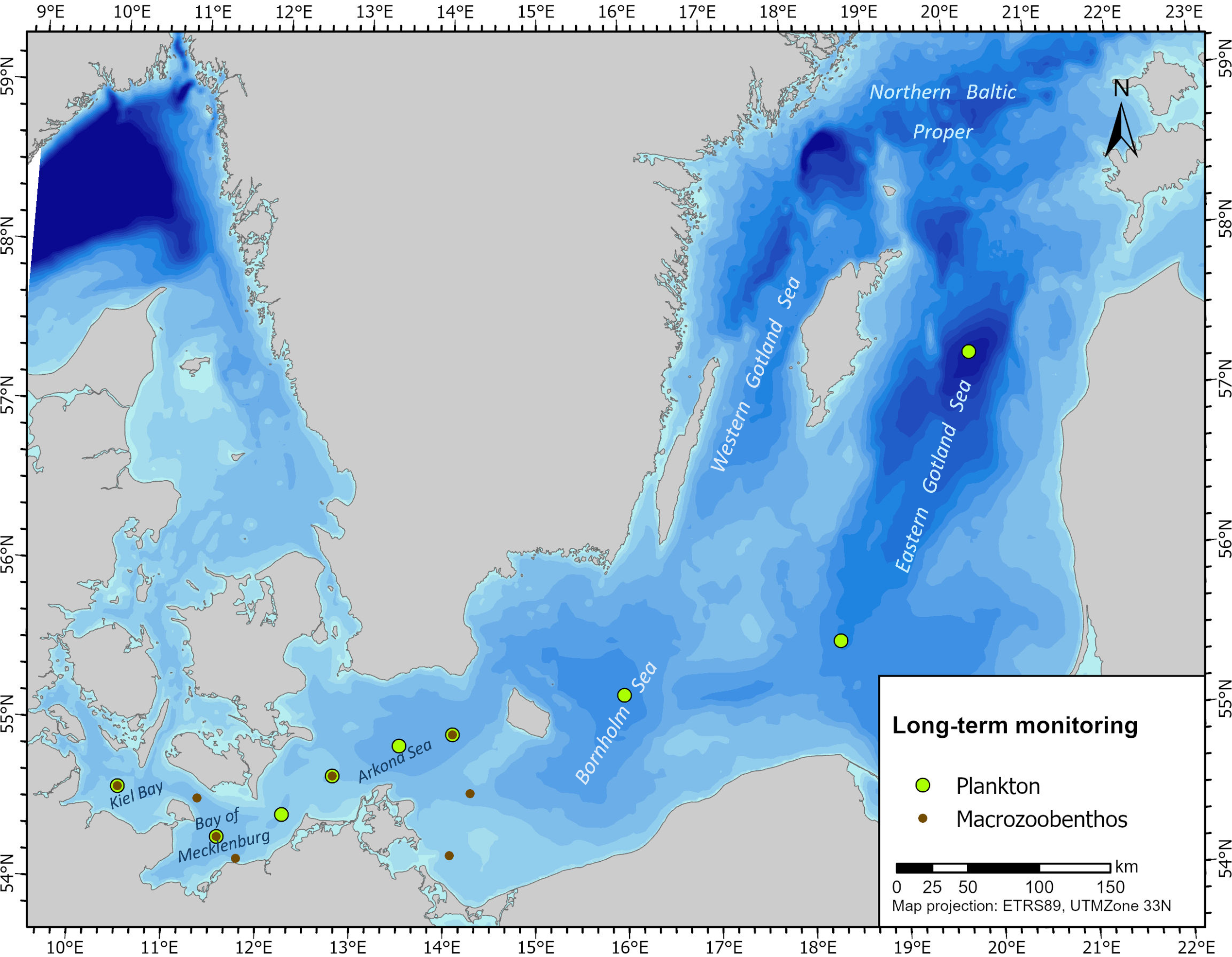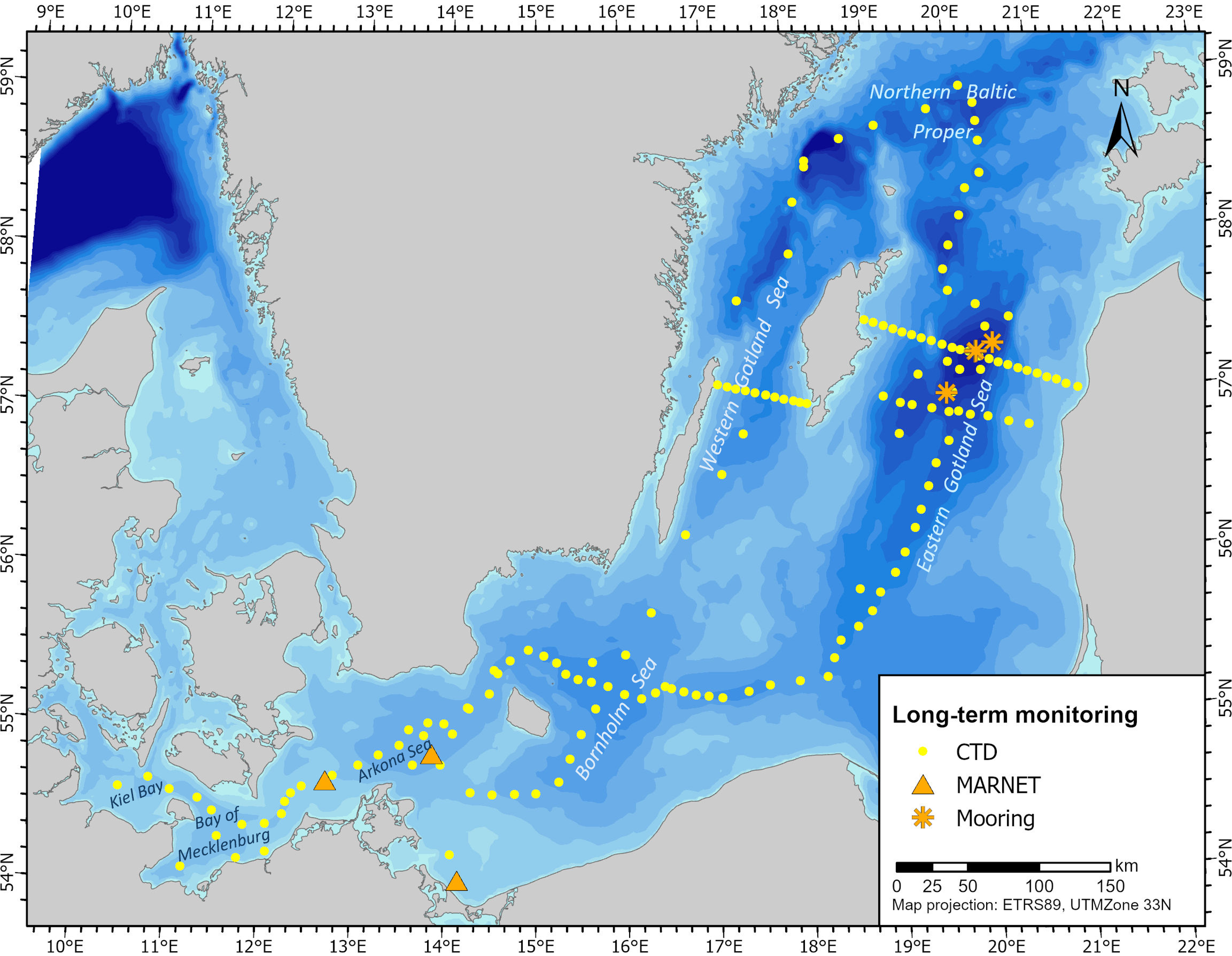 Für die Erhebung der hydrographischen, chemischen und biologischen Daten für das Umweltmonitoring werden jährlich im Februar, März, Mai, August und November Monitoringseereisen entlang einer festen Route von der Kieler Bucht, über die Mecklenburger Bucht in die Arkonasee, in das Bornholmbecken und in das östliche und westliche Gotlandbecken durchgeführt. Seit 2023 wird diese Reise im Mai erweitert bis in den Bottnischen Meerbusen. In den Fahrtberichten dieser Seereisen werden die erhobenen Daten beschrieben und erste Messergebnisse gezeigt.