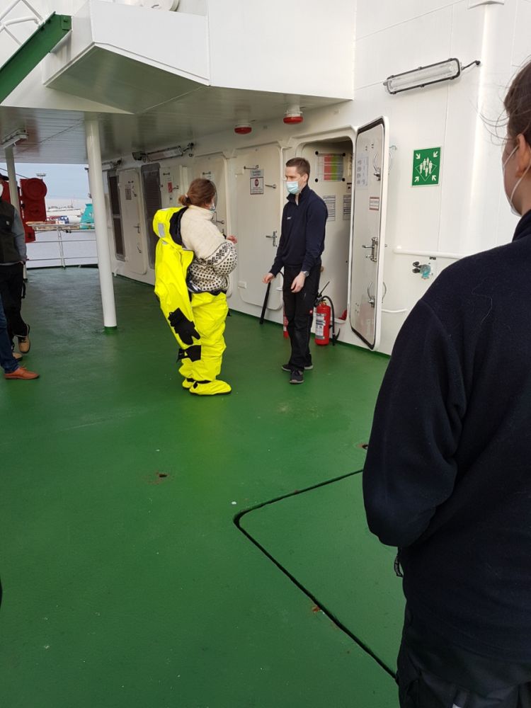 The welcome on board also included the obligatory safety briefing by the 1st officer including the fitting of a survival suit - and don't forget: At the end of the procedure, you should definitely press the air out of the voluminous suit, otherwise you might end up headfirst in the water in an emergency.