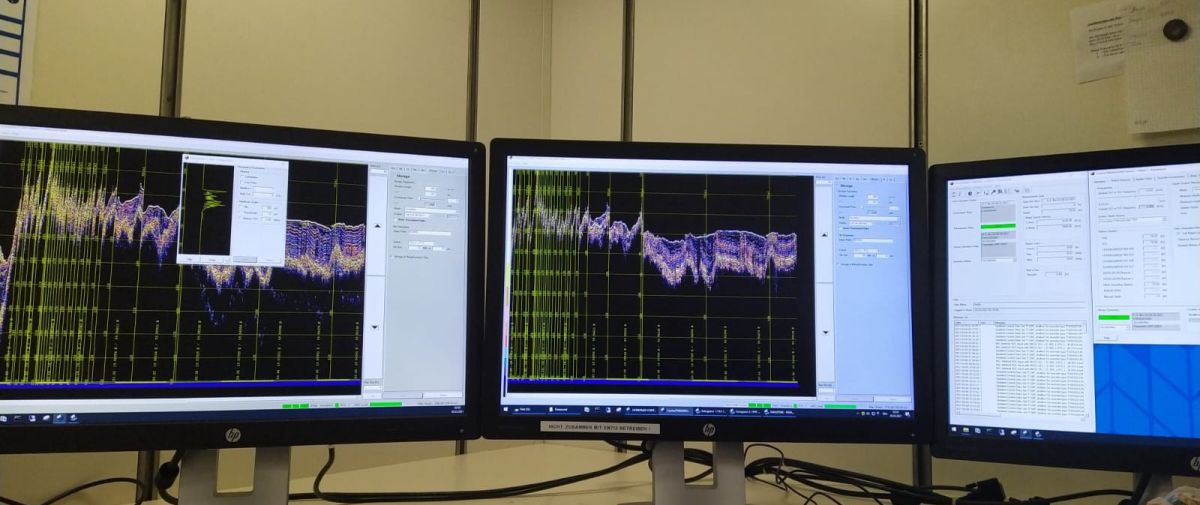 Anyone who has been on a ship knows echo sounders, which determine the water depth. We use special echo sounders that are permanently installed in the ship's hull and can "look" into the seabed. The emitted sound signal penetrates the sediment and is reflected back to the ship whenever the material changes. These echoes are converted by the computer into an image that reflects the different sediment layers.