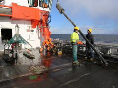 The “great coring” has begun. Today and on the following days, a total of 13 tube cores, each 6 meters long, will be pulled, cut open on deck and documented. Matthias Moros explains the history of the Baltic Sea since the last glacial to all Baltic Sea newcomers on the basis of the sediments. We already got to know the Baltic Ice Lake as the first post-glacial stage about 12,000 to 10,000 years ago in the form of clayey pink-grey deposits. Next comes the relatively short Yoldia phase around 10,000 to 9,700 years before today. It is preserved in form of deposits of a water body of oceanic character, which was created when in central Sweden a passage for North Sea water had opened, through which salt water now flowed into the Baltic Sea. Above it follow the deposits of a freshwater lake - they represent the 9,500 to 8,000 year old Ancylus stage. The mid-Swedish passage had closed again due to the uplift of the Scandinavian mainland after the disintegration of the ice sheet, so that only freshwater could enter the Baltic Sea basin. Finally, around 7,000 B.P., parallel to the time of the Holocene thermal maximum, there was a drastic rise in sea level, which again created new, albeit narrow, connections to the North Sea in the form of the Belts and Sounds. The thus formed Littorina Sea was already very similar to today's Baltic Sea - just also a brackish water sea with strongly impeded water exchange.