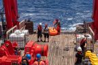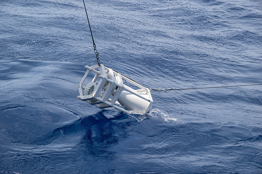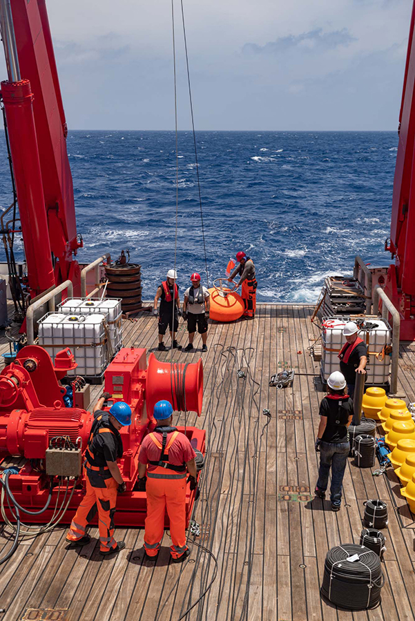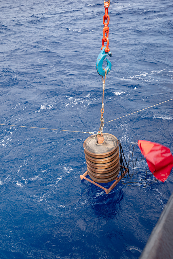 Another 550 metres of mooring line later, the acoustic releasers were lowered into the water. They are a crucial part of the mooring as they are needed to retrieve the measuring devices in two years’ time: After receiving an acoustic signal from the ship, they disconnect the line with the instruments from the bottom weight and allow it to float to the surface. To increase the chances of a successful release, we have installed two independent releasers. At 3:13 p.m., almost three hours after the top buoy, the bottom weight finally went in. It has a parachute so that it doesn’t plummet down too quickly. This is important, because this way, all components of the mooring are pulled into the depth evenly without tangling. And so we looked for the buoyancy packs and the top buoy with some tension to see if everything goes as planned. Reassuringly, the buoyancy packs disappeared from the water surface one after the other and after about ten minutes the top buoy also vanished from sight. It will float at a depth of about 150 to 200 metres below the surface, hopefully deep enough not to be caught by fishing activities.