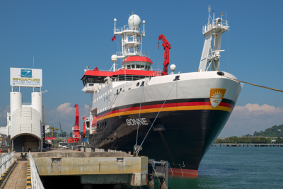 Our project and the expedition are also of interest to the local press. The German Embassy in Singapore helped to arrange an interview of a journalist from Eco-Business with Prof. Waniek (the chief scientist) and Prof. Schulz Bull, in which both reported about the upcoming four expedition weeks. Meanwhile there was a lot of activity on board. The equipment was distributed to the laboratories from the containers and the labs were set up.