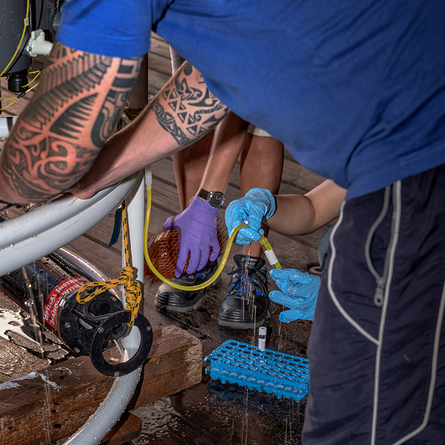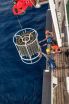 In the early morning of August 6, we reached the study area and our first sampling station. Our work started – like always at a new station – with the deployment of the CTD with the water sampler rosette, because we need to know more about the properties of the water column beneath the RV SONNE to plan our sampling. On the way down – here it was about 1900 metres to the seafloor –, the CTD sensors measure temperature, salinity, dissolved oxygen, chlorophyll a, turbidity and a few other parameters. The data are transmitted directly to the ship, where the depth profiles of all measurements can be viewed immediately. When the CTD has reached the bottom, we use the profiles to jointly decide, at which depths the instrument should stop on its way up to take water samples that suit our respective research objectives. Once the CTD is back on board, everyone flocks around to get their samples. A stringent plan is necessary to ensure that the water is tapped in the right order and that everyone gets the water volume necessary for their work.