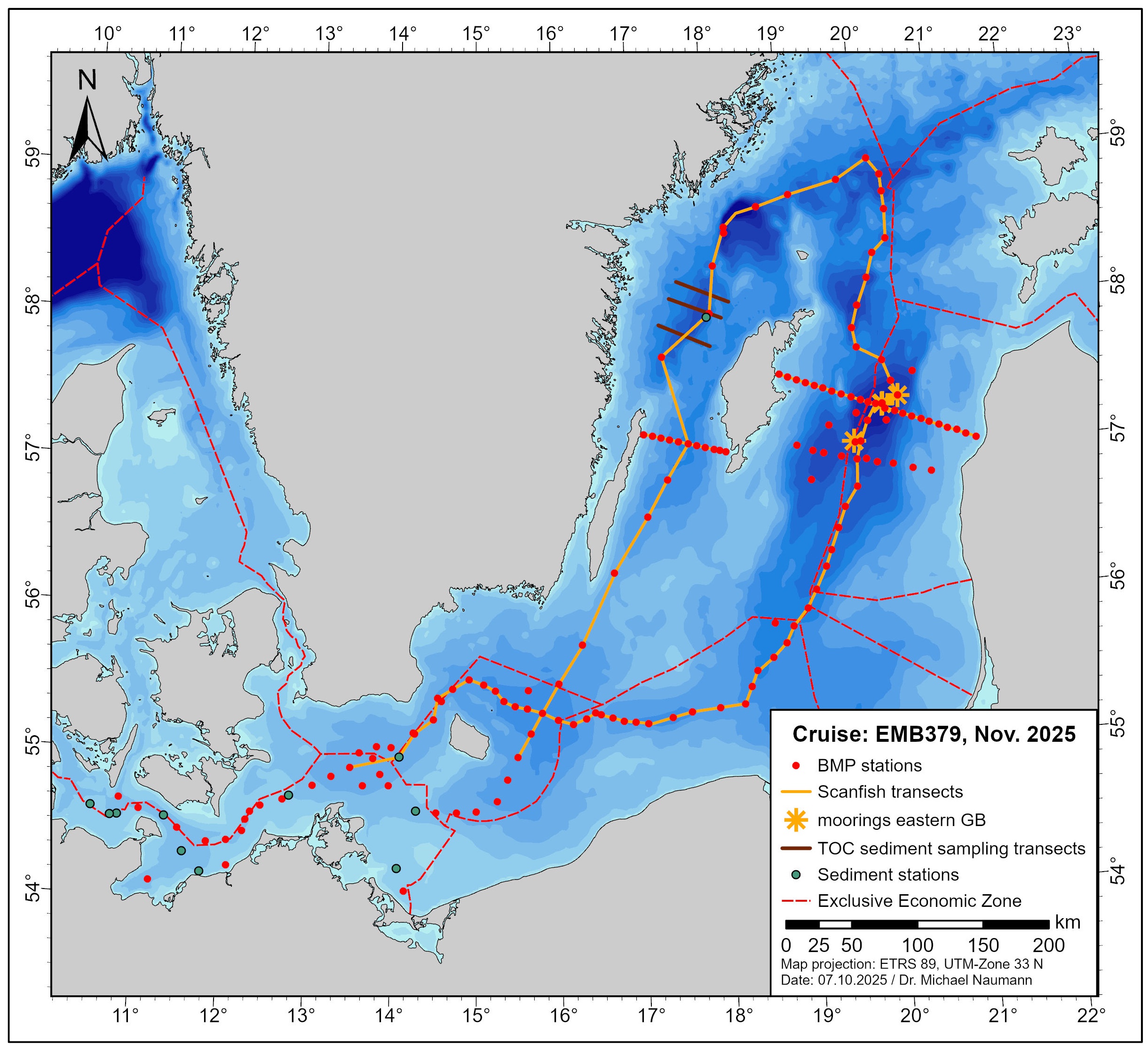 Auf der 16-tägigen Forschungsfahrt mit der „Elisabeth Mann Borgese“ werden an etwa 100 Stationen von der westlichen bis in die zentrale Ostsee Probenahmen durchgeführt. Auf dem Arbeitsprogramm steht die Erfassung hydrographischer und chemischer Daten sowie das Sammeln biologischer Proben, die für eine Momentaufnahme des Ökosystemzustands der Ostsee im Herbst 2025 genutzt werden und zum Systemverständnis auf langen Zeitskalen beitragen. Fahrtleiter der Expedition ist der IOW-Ozeanograph und Geologe Michael Naumann.
