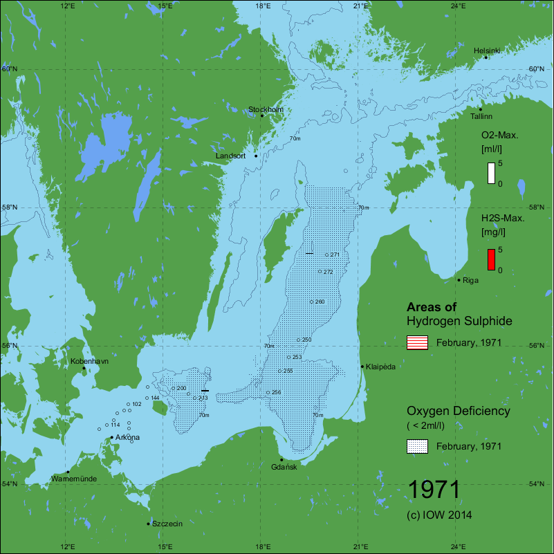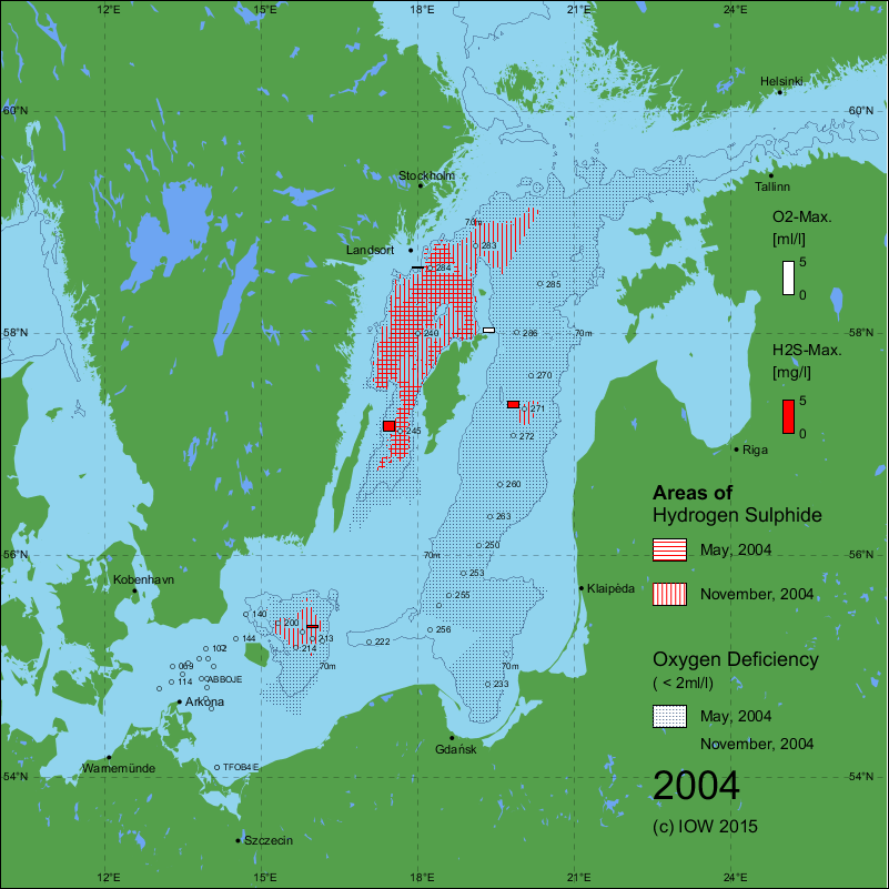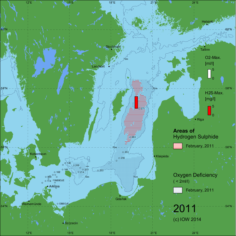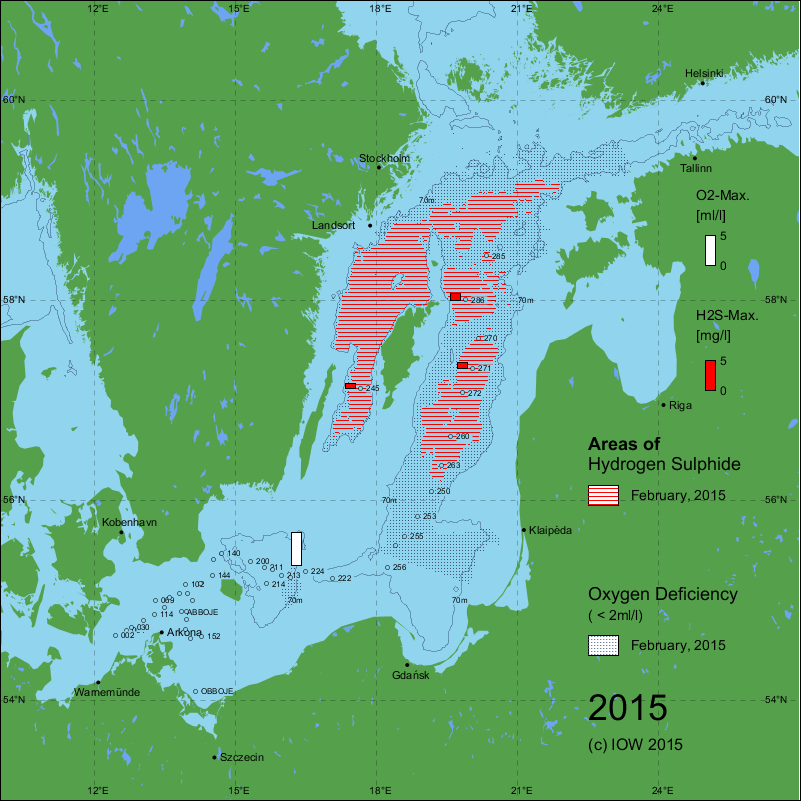 As can be seen in the following graphs a new stagnation period had started in 1995 which continued until the Major Baltic Inflow in 2003. A moderate inflow event in 2011 was able to ventilate the Bornholm and Gdansk Basin whereas the eastern Gotland Basin remained anoxic. Only in 2014, oxygen could be masured in the bottom water of the central station 271 in that basin. One of the strongest Major Baltic Inflows ever observed was registered in December 2014. Remarkable effects in the central Baltic Sea will be expected in 2015.