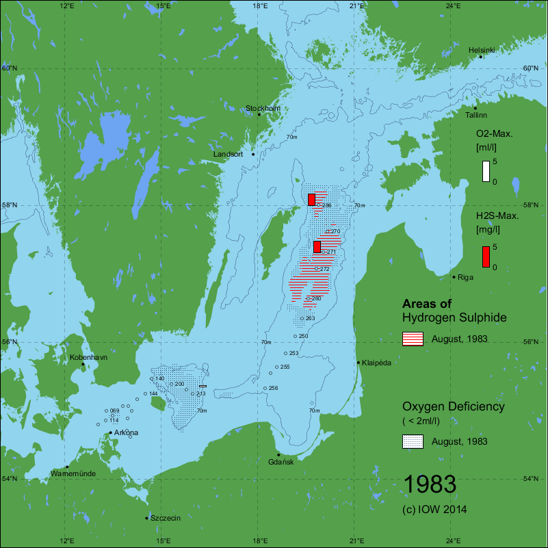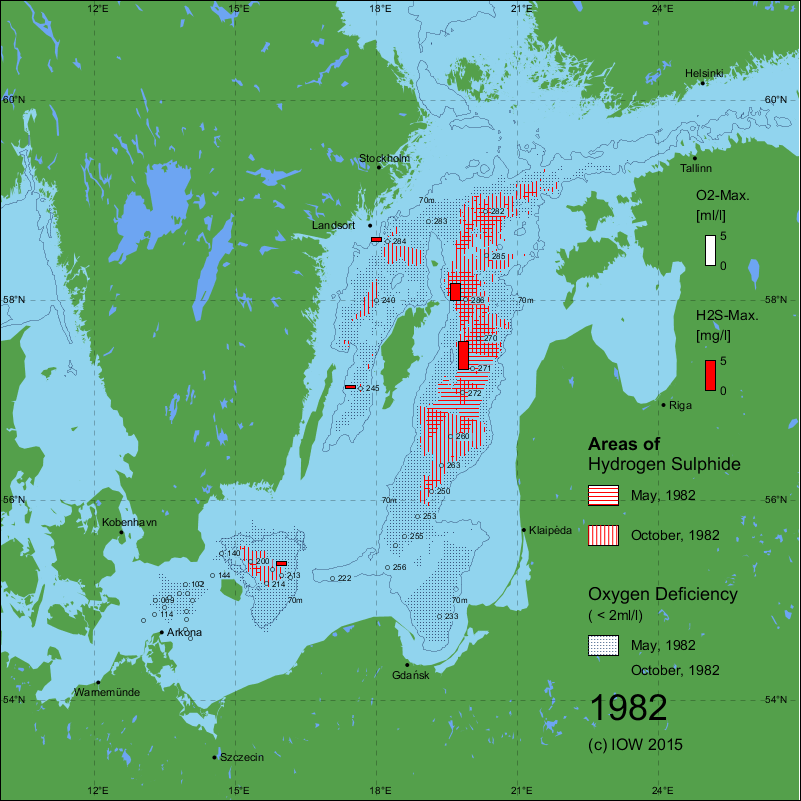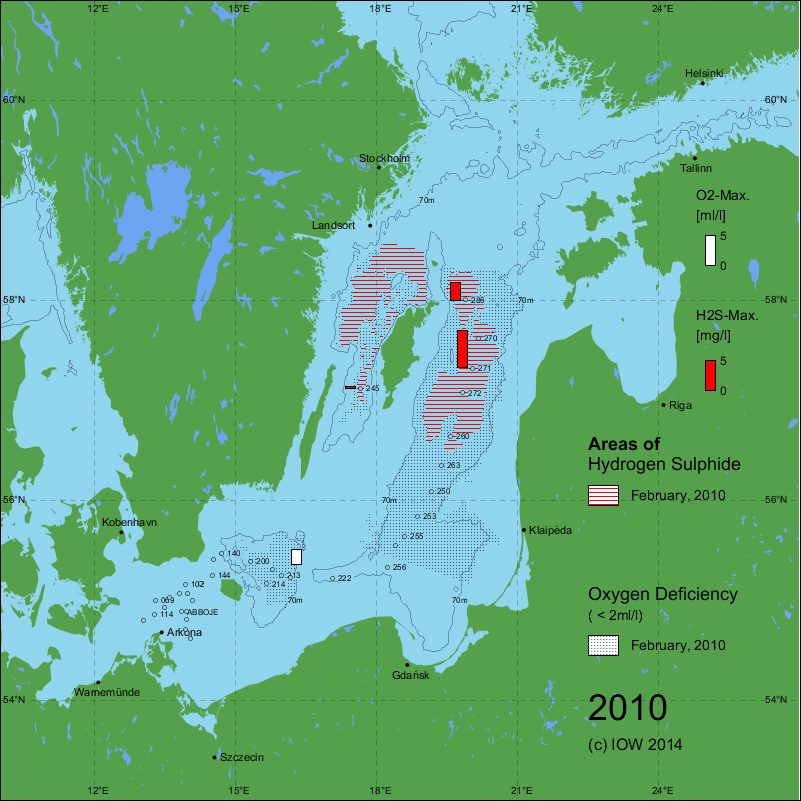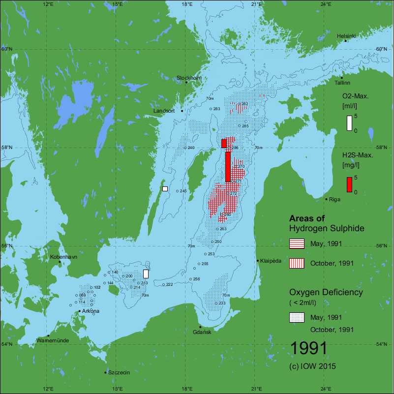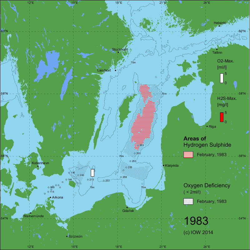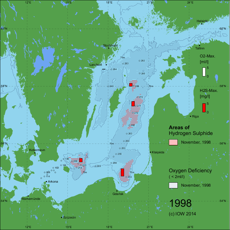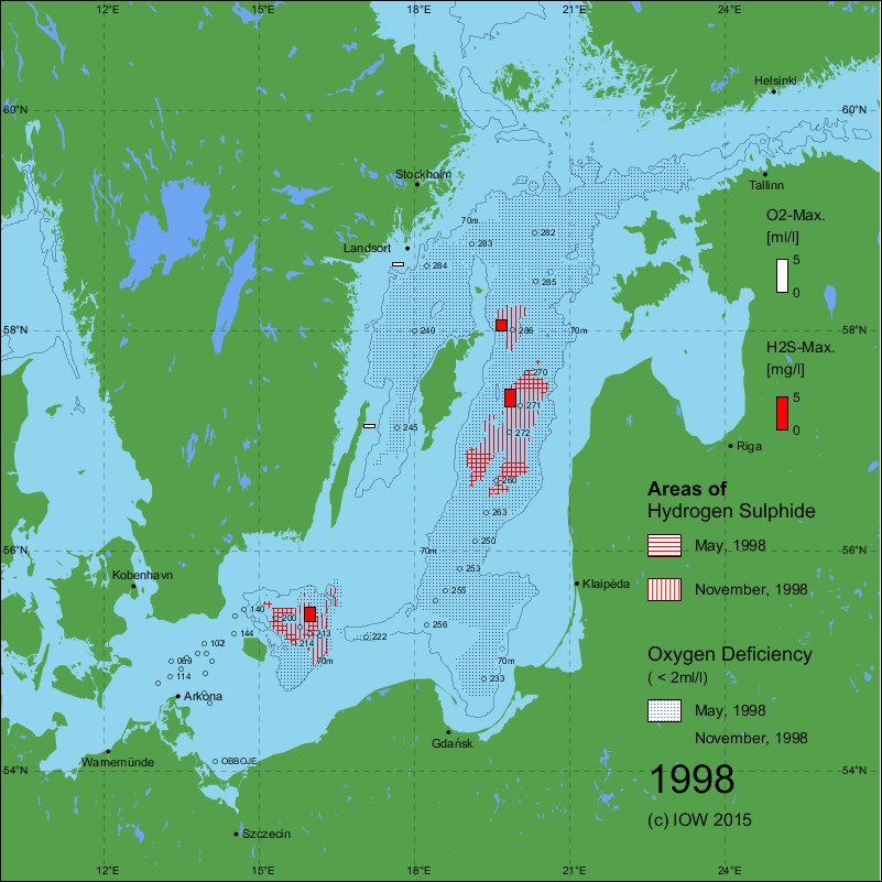 The graphs show the maximal areas of oxygen deficiency (<2 ml/l) and hydrogen sulphide in the near-bottom layer of the Baltic Sea in the last years. Histograms show the maximum oxygen resp. hydrogen sulphide concentrations in this layer for selected stations. Additionally, distribution patterns from special monitoring cruises (February, March/April, May, July/August, October/November) from 1969 onwards are shown.