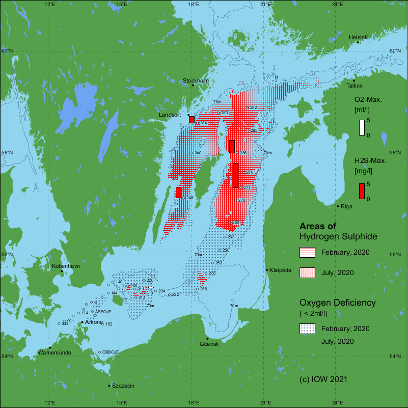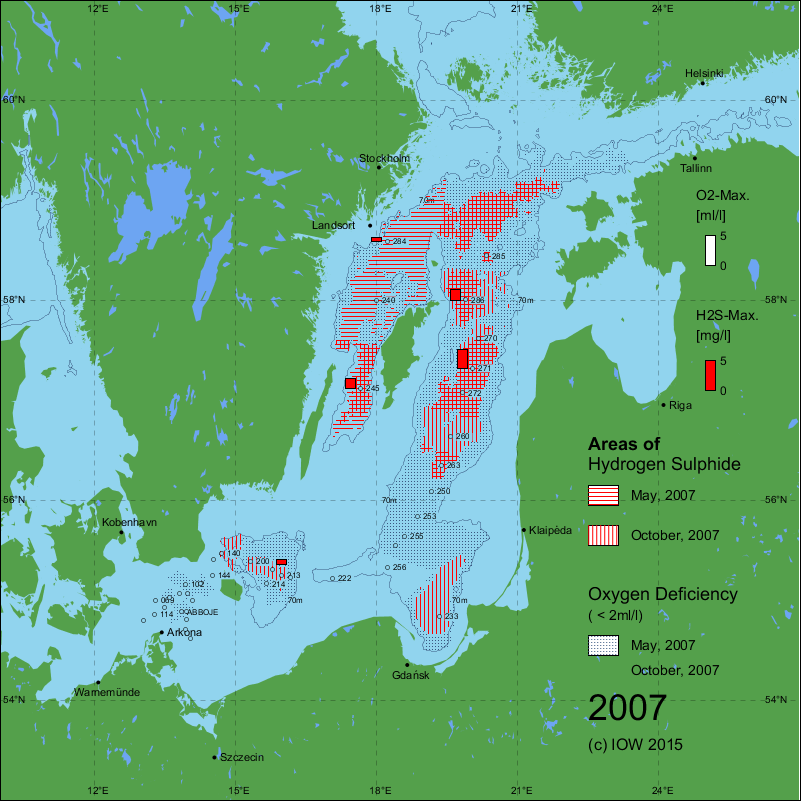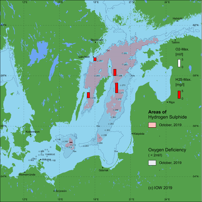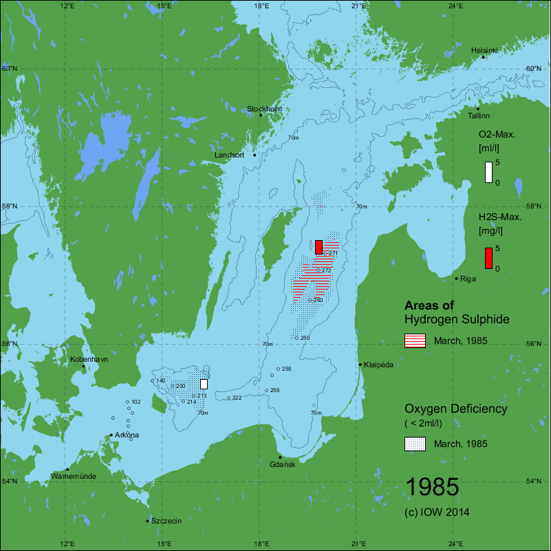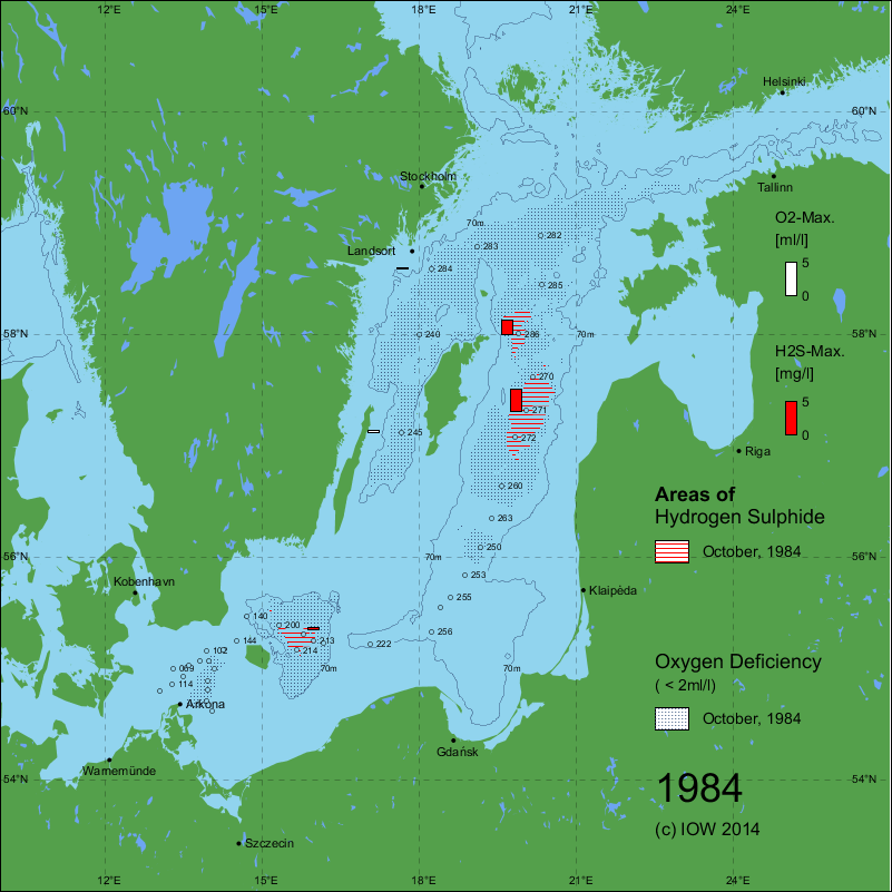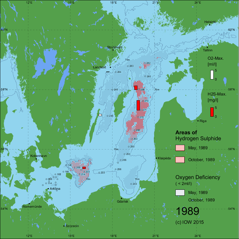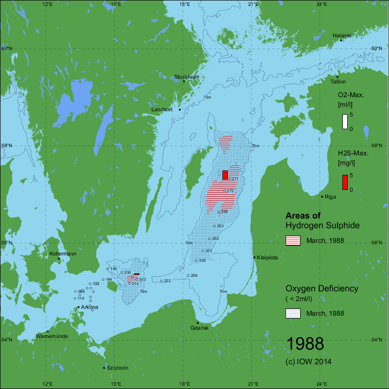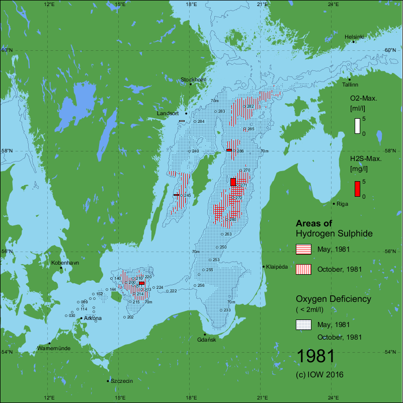 The graphs show the maximal areas of oxygen deficiency (<2 ml/l) and hydrogen sulphide in the near-bottom layer of the Baltic Sea in the last years. Histograms show the maximum oxygen resp. hydrogen sulphide concentrations in this layer for selected stations. Additionally, distribution patterns from special monitoring cruises (February, March/April, May, July/August, October/November) from 1969 onwards are shown.
