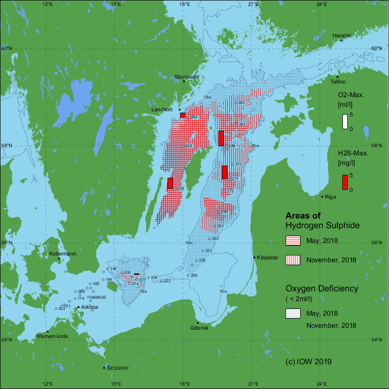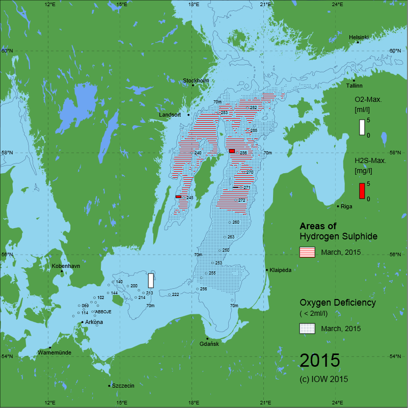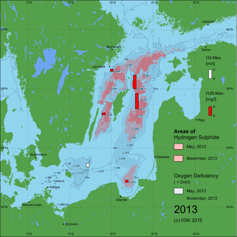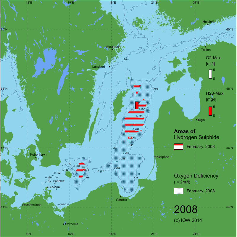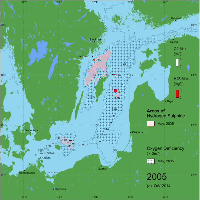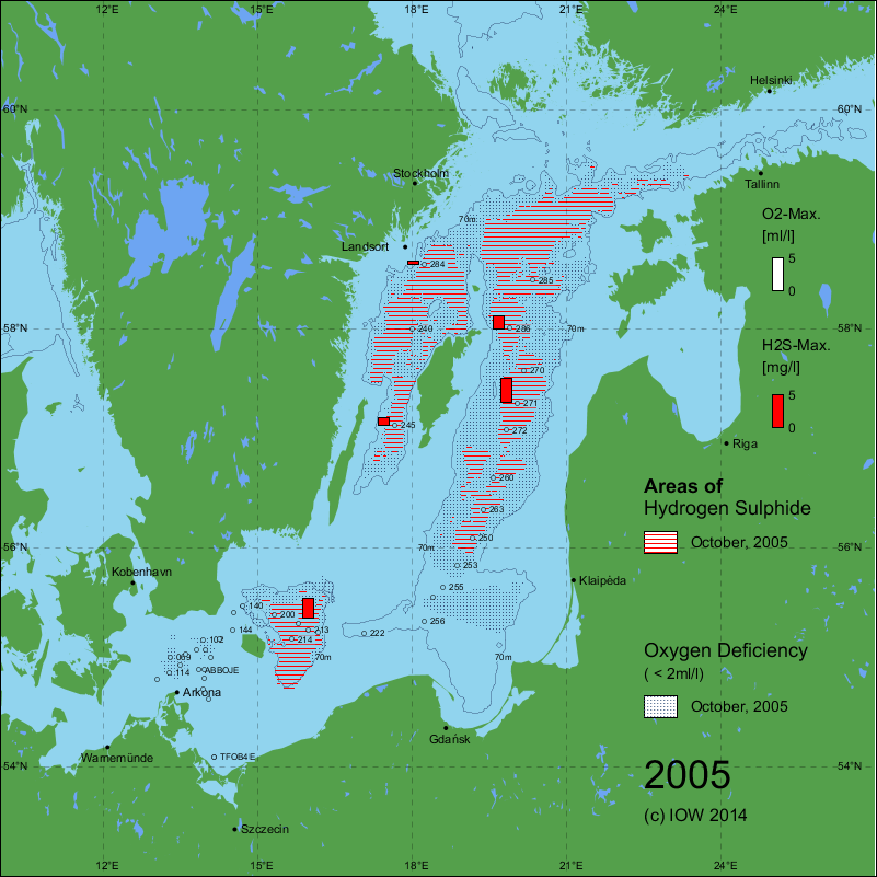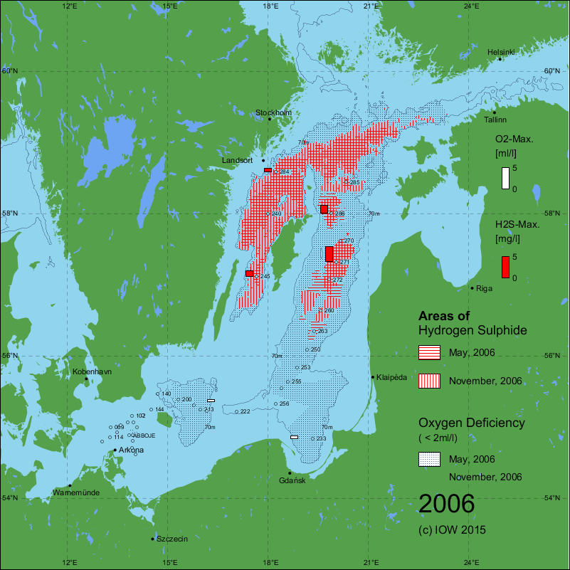 Due to the restricted water exchange with the North Sea and the permanent haline stratification in the central Baltic Sea, stagnation periods occur regularly in the deep basins. Stagnation periods are characterized by the depletion of nitrate, increasing phosphate and ammonium concentrations and decreasing salinity and oxygen content in the deep water, sometimes culminating in the formation of considerable hydrogen sulphide concentrations. A renewing of the deep water can only take place by extreme inflow events into the Baltic Sea - termed major Baltic inflows - which transport salt and oxygen rich water into the deep basins.