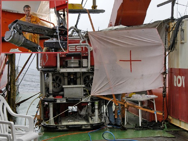 Es hatte so ein schöner Tag werden sollen. Vor drei Tagen war nach dem sehr erfolgreichen Tauchgang 203, bei dem wir erstmals mit der benthischen Kammer direkt Umsatz- und Flussraten am Meeresboden messen konnten, leider eine schwerwiegende Störung des Orion-Greifarms des ROV aufgetreten. Ziemlich dramatisch war es, denn der Greifarm bewegte sich völlig unkontrolliert und ist aufgrund seiner Reichweite dazu in der Lage, großen Schaden am Gesamtsystem anzurichten, etwa durch eine Beschädigung einer der Kameras. Selbst ein Abriss der Hydraulik kann in diesem Zustand nicht ausgeschlossen werden. Daher war der Arm am Ende des Tauchgangs durch Schließen eines Solenoid-Ventils quasi eingefroren worden. Für die wissenschaftliche Perspektive ist der Vorgang nicht minder dramatisch. Praktisch alle Probennahme- und Meßsysteme werden von dem siebengelenkigen Arm ausgeführt. Der Riggmaster, sein zu fünf Funktionen fähiges Pendant auf der Backbordseite, ist zwar ein "Schwerstarbeiter", aber in seiner Mobilität doch sehr begrenzt. Achtundvierzig Stunden hatte es nach dem Ausfall gedauert, bis das ROV-Team zumindest an Deck wieder zufrieden sein konnte mit dem Zustand des Geräts. In dieser Zeit hatte das Achterdeck einem Feldlazarett geähnelt, nach Öffnen der Hydraulik war in der Mannschaft von FS SONNE das geflügelte Wort der "OP am offenen Herzen" aufgekommen. Ein rotes Kreuz war plötzlich auf dem Tuch erschienen, das ein wenig vor Wind und Feuchtigkeit schützen sollte. Just bei Fertigstellung hatte uns dann aber ein Sturmtief aufgesucht - weitere 24 Stunden, die mit dem konventionellen Programm, d.h. Einsatz von videogeführtem Multicorer und Schwerelot für die Sedimentbeprobung und CTD/Kranzwasserschöpfer - mittlerweile mit einer ganzen Reihe zusätzlicher Sensoren ausgestattet - für die Beprobung des Wasserkörpers über den CO2-reichen Gebieten am Meeresgrund. Viel wurde hier abgearbeitet, doch nun ist es wieder höchste Zeit, unsere gezielten Studien mit genauer Betrachtung und Probennahme weiterzuführen, die eben nur mit Hilfe des ROVs durchzuführen sind.
