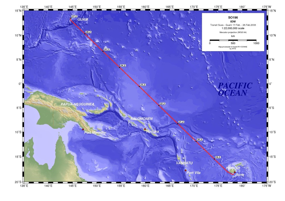 Ziel der Fahrt war der tiefe Bereich des Ostchinesischen Meeres zwischen Japan und Taiwan, der so genannte Okinawa-Trog. Hier tritt in drei Gebieten zwischen 1200 bis 1600 m Wassertiefe flüssiges Kohlendioxid aus - ein weltweit einzigartiges Vorkommen.