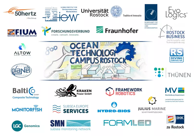 Seit über drei Jahren ist das IOW starker Partner im OTC Rostock. Im Rahmen der Cluster-Förderung "Cluster4Future" gibt es aktuell im Ocean Technology Campus Rostock 15 F+E-Projekte, an denen jeweils auch Forschungseinrichtungen bzw. die Universität Rostock in Kooperation mit Unternehmen der freien Wirtschaft arbeiten. Die Unternehmen tun dies mit einem starken Bekenntnis, da große Eigenanteile bereitgestellt werden müssen. Die 15 Projekte gruppieren sich in fünf verschiedene sog. Innovationsfelder auf, die in der Branche als die für die Zukunft Markt-bestimmenden Themen identifiziert wurden. Es sind dies: Digitalisierung (Digital Mission), Umweltbeobachtung (Ocean Lense), Geräte-Autonomisierung (Subsea Mobility and Autonomy), Nachhaltige Nutzung der Meere (Sustainable Ocean Use) sowie die Ausprägung eines Innovations-Ökosystems (Ocean Open Innovation).