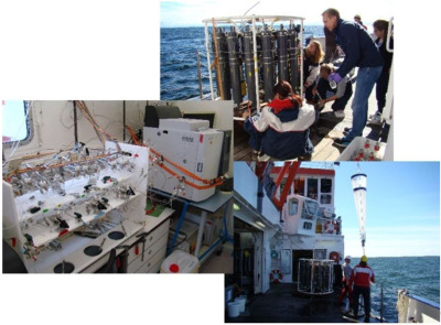 Field work on RV Alkor in the central Baltic Sea in summer 2016. Top: water sampling. Right: purge and trap system to measure methane production rates by zooplankton. Left: zooplankton sampling.
